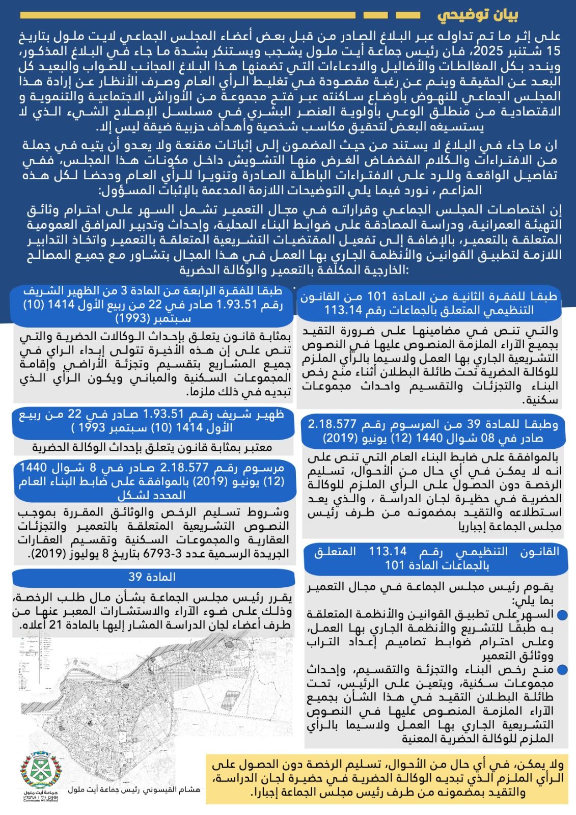 ويأتي هذا البلاغ في سياق نقاش متواصل داخل جماعة أيت ملول حول تدبير قطاع التعمير وبعض الملفات المرتبطة به، حيث يترقب الرأي العام المحلي مآلات هذه التجاذبات وكيفية معالجتها داخل الإطار المؤسساتي والقانوني.
