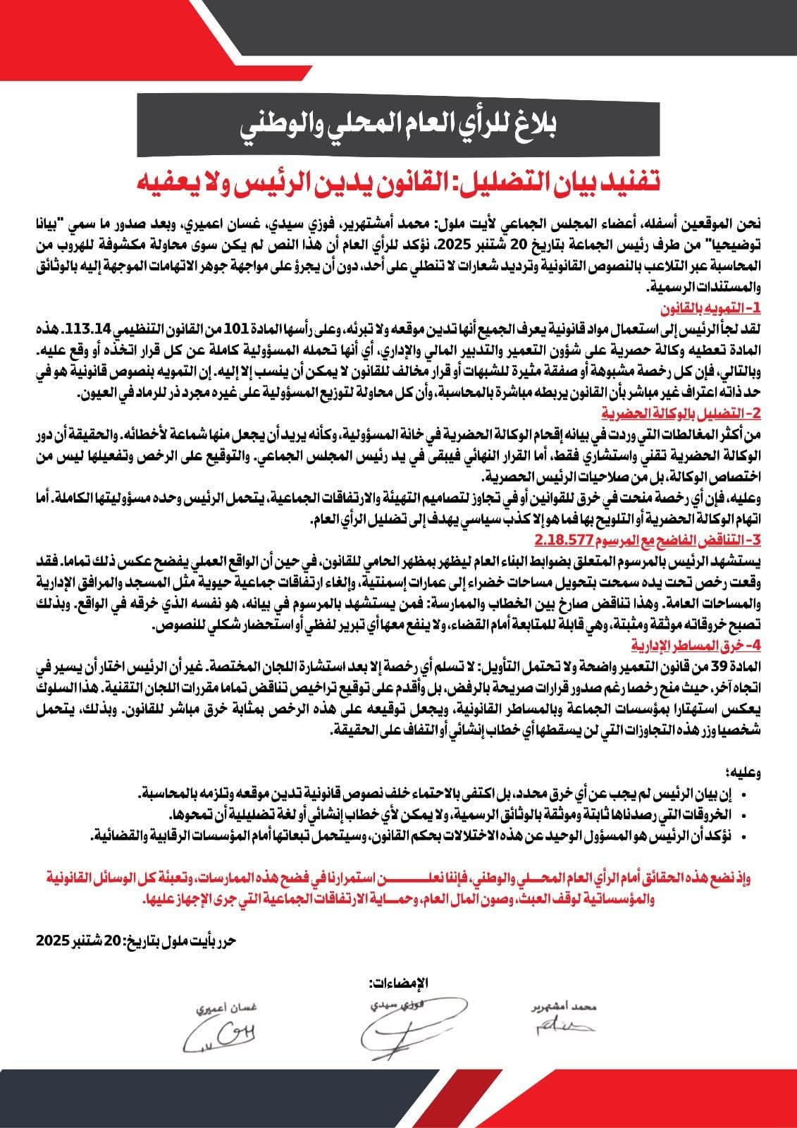 أصدر ثلاثة من أعضاء المجلس الجماعي لأيت ملول، وهم محمد أمشتهرير، فوزي سيدي، وغسان أعميري، بلاغاً للرأي العام المحلي والوطني، أكدوا فيه أن البيان التوضيحي الصادر عن رئيس المجلس بتاريخ 20 شتنبر 2025 لم يقدّم إجابات واضحة عن بعض الخروقات التي يثيرها المنتخبون.