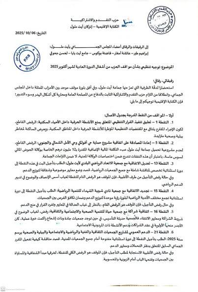 في خطوة تعكس وضوح الرؤية السياسية والتزام الحزب بخدمة المصلحة العامة، وجهت الكتابة الإقليمية لحزب التقدم والاشتراكية بإنزكان ايت ملول، أمس الإثنين 6 أكتوبر 2025، مراسلة تنظيمية إلى أعضائه داخل المجلس الجماعي لأيت ملول، تضمنت توجيهات دقيقة حول المواقف التي يتعين اتخاذها خلال أشغال الدورة العادية لشهر أكتوبر الجاري.