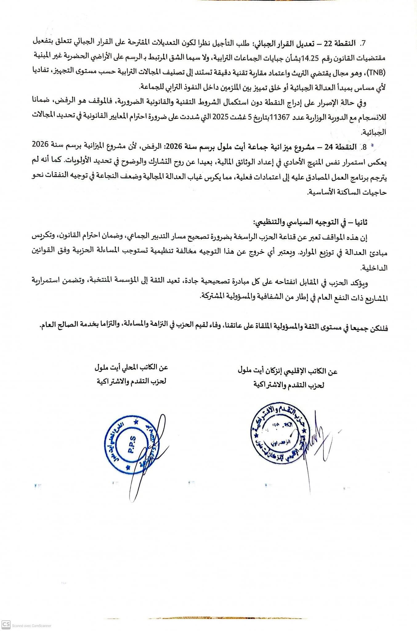 النقطة8: مشروع ميزانية جماعة ايت ملول برسم سنة 2026:الرفض، لأن مشروع الميزانية برسم سنة 2026 يعكس استمرار نفس النهج الأحادي في اعداد الوثائق المالية بعيدا عن روح التشارك و الوضوح في تحديد الأولويات ،كما أنه لم يترجم برنامج العمل المصادق عليه في اعتمادات فعلية: مما يكرس غياب العدالة المجالية وضعف النجاعة في توجيه النفقات نحو حاجيات الساكنة الأساسية.