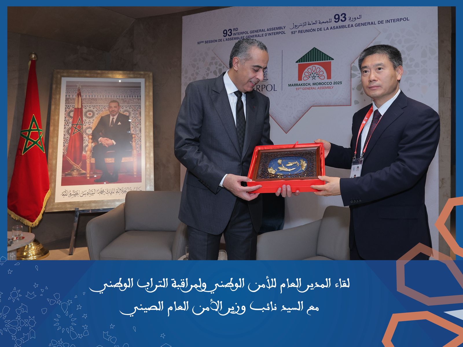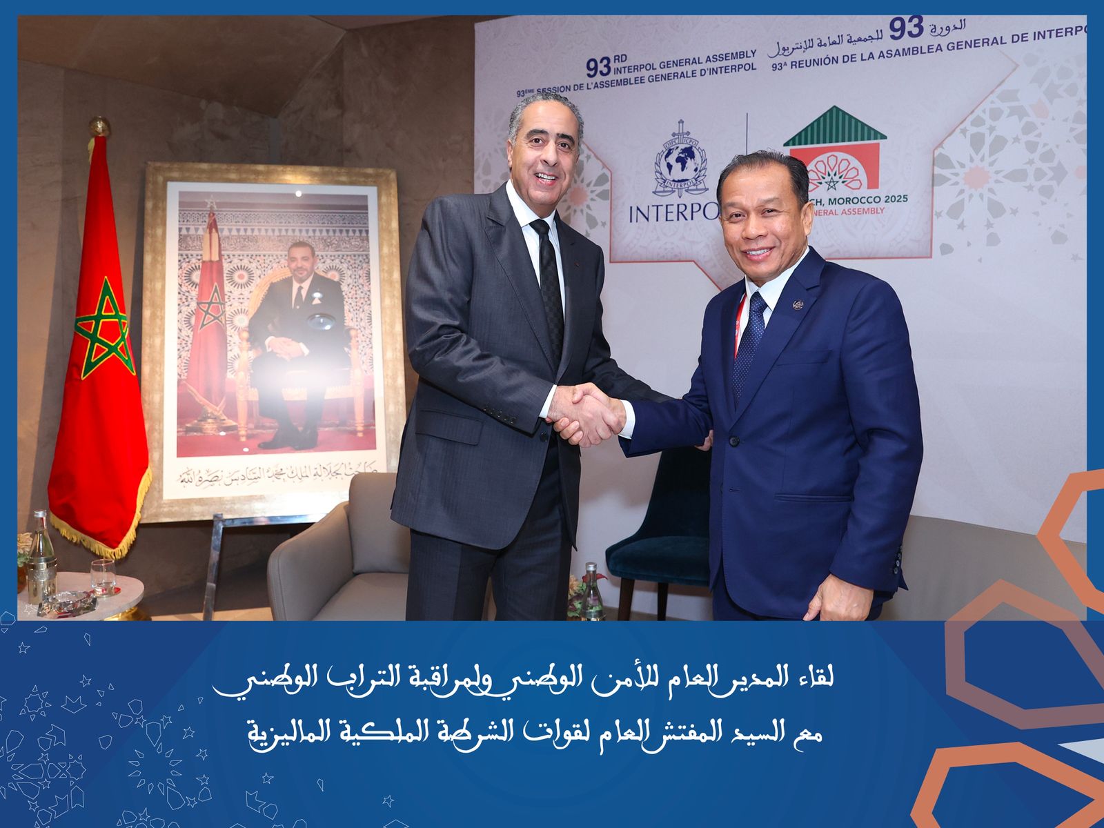 عقد المدير العام للأمن الوطني ولمراقبة التراب الوطني عبد اللطيف حموشي والوفد الأمني المرافق له ثلاثة وأربعين اجتماعا ثنائيا مع رؤساء وفود الدول والمنظمات الدولية المشاركة في أشغال الجمعية العامة للمنظمة الدولية للشرطة الجنائية أنتربول، التي تحتضنها مدينة مراكش خلال الفترة الممتدة من 24 ال 27 نونبر 2025.