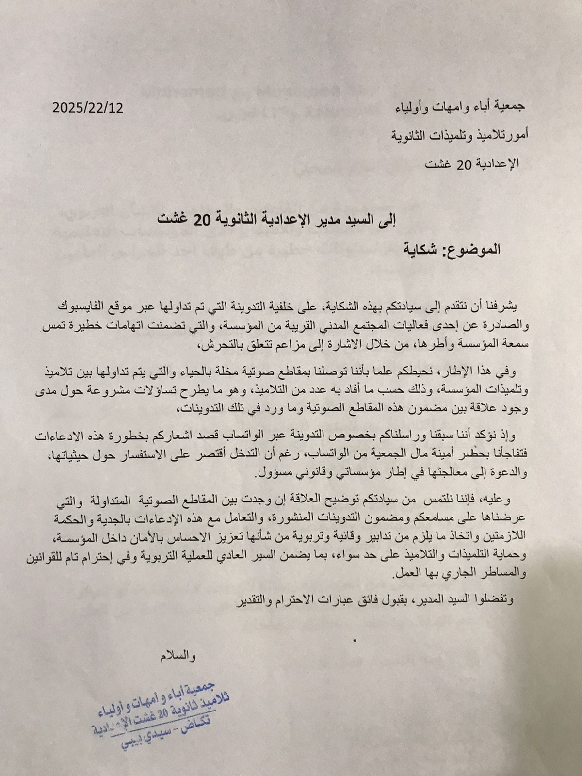 وأوضح البيان أن إدارة المؤسسة لم تتوصل كذلك بأي شكاية من طرف تلميذ أو تلميذة أو من أولياء أمورهم بخصوص ما يتم الترويج له، نافيًا وجود أي ارتباط مؤكد بين المؤسسة وما ورد في التدوينات أو التسجيلات الصوتية المتداولة، كما أشار إلى أن بعض فعاليات المجتمع المدني القريبة من المؤسسة نفت بدورها أي علاقة لها بما نُشر على “فيسبوك”، خاصة وأن التدوينة المعنية لم تُشر لا من قريب ولا من بعيد إلى اسم الجمعية أو المؤسسة التعليمية.