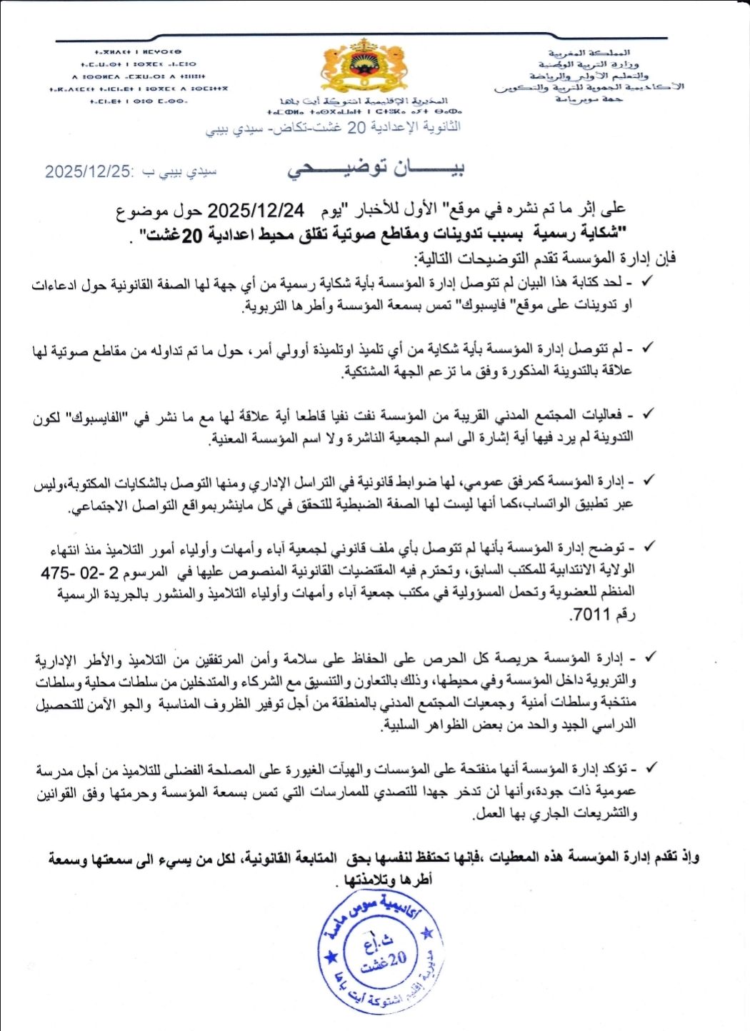 أصدرت إدارة الثانوية الإعدادية 20 غشت بسيدي بيبي، التابعة للمديرية الإقليمية لاشتوكة آيت باها، بيانًا توضيحيًا ردًّا على ما تم تداوله بأحد المواقع الإخبارية، بخصوص خبر مفاده تقديم شكاية رسمية ضد مدير المؤسسة، على خلفية تدوينة منشورة بموقع “فيسبوك” ومقاطع صوتية متداولة.