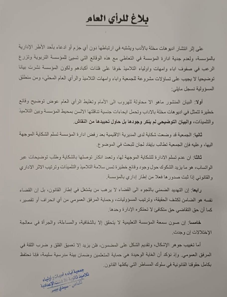أصدرت جمعية آباء وأمهات وأولياء أمور التلاميذ بيانًا توضيحيًا ردًّا على البلاغ الصادر عن إدارة الثانوية الإعدادية 20 غشت بسيدي بيبي، التابعة للمديرية الإقليمية لاشتوكة آيت باها، والذي نفت فيه توصلها بأي شكاية رسمية بخصوص ما تم تداوله إعلاميًا حول تدوينات على موقع “فيسبوك” ومقاطع صوتية متداولة.