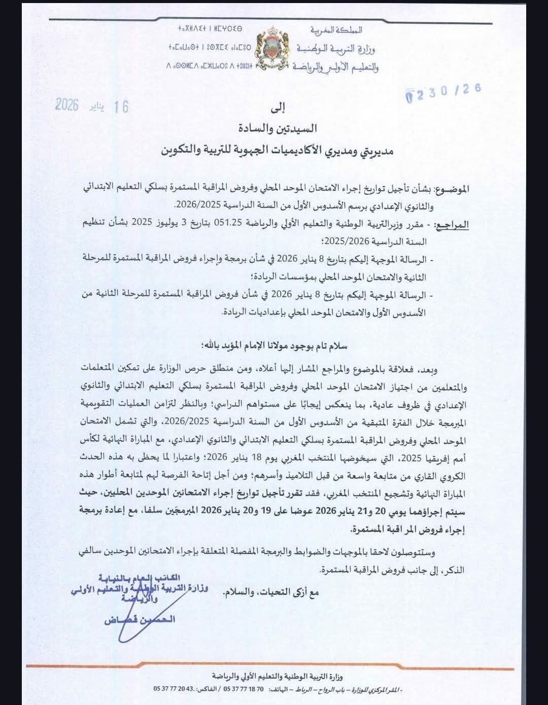 وبناءً عليه، تقرر تأجيل الامتحانين الموحدين المحليين اللذين كانا مبرمجين يومي 19 و20 يناير 2026، ليتم إجراؤهما يومي 20 و21 يناير 2026، مع إعادة برمجة فروض المراقبة المستمرة وفق جدولة جديدة سيتم الإعلان عنها لاحقًا.