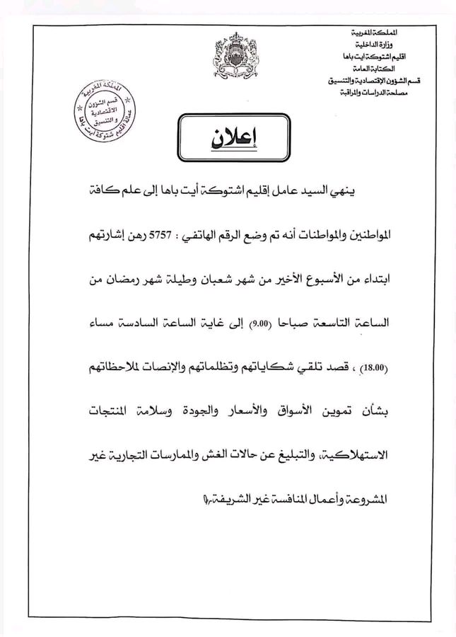 في مبادرة تعكس روح المسؤولية الإدارية ونهج القرب من المواطنين، أقدم السيد عامل إقليم اشتوكة آيت باها على تخصيص الرقم الهاتفي 5757 رهن إشارة الساكنة طيلة شهر رمضان المبارك، وذلك من أجل تلقي الشكايات والتبليغ عن مختلف أشكال الغش والممارسات التجارية غير المشروعة، إلى جانب تتبع وضعية تموين الأسواق ومراقبة الأسعار وجودة المنتجات المعروضة للاستهلاك.