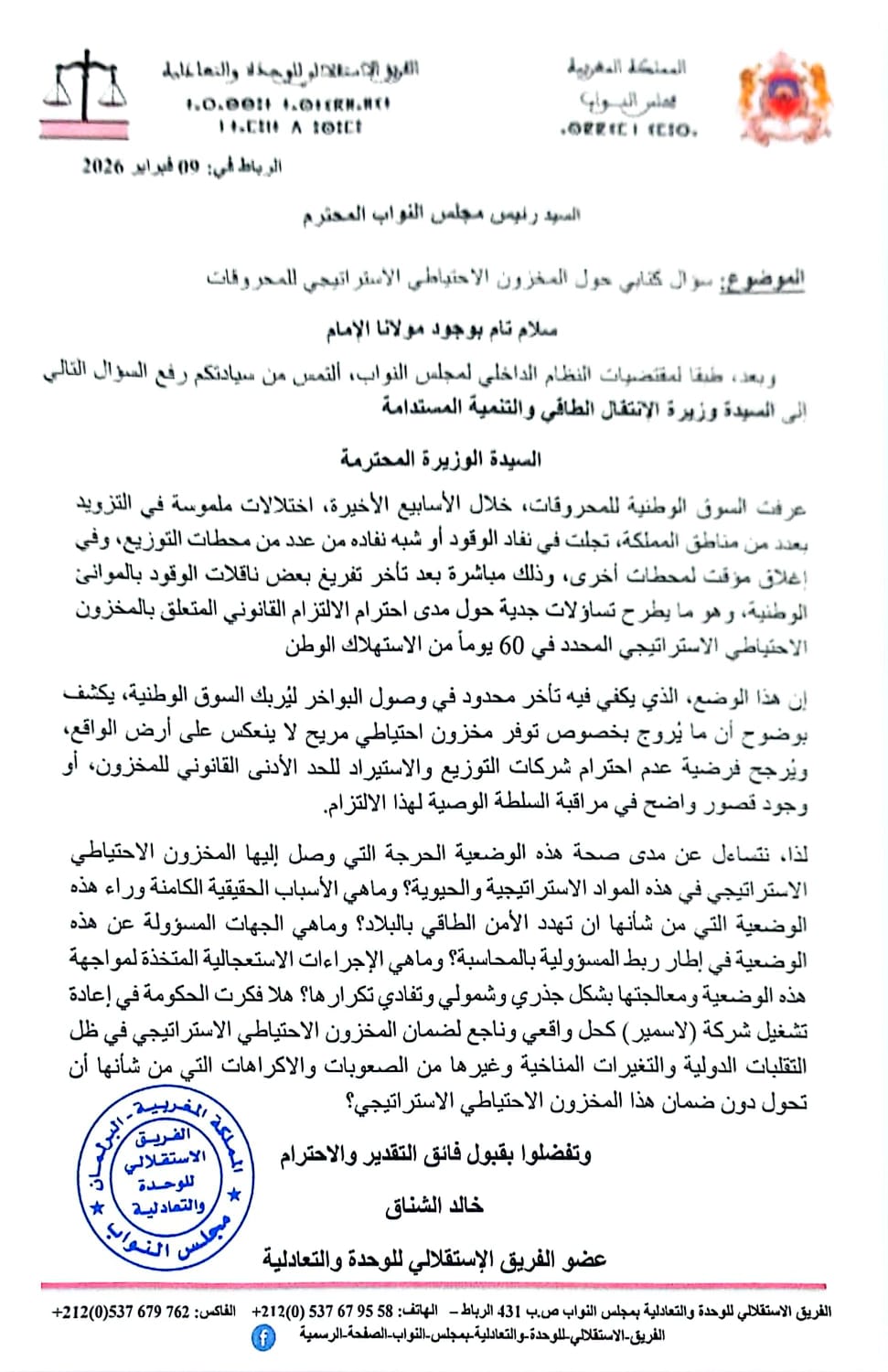 دخل ملف تزويد السوق الوطنية بالمحروقات مرحلة جديدة من النقاش السياسي والمؤسساتي، بعد توجيه البرلماني خالد الشناق سؤالا كتابيا إلى وزيرة الانتقال الطاقي والتنمية المستدامة حول وضعية المخزون الاستراتيجي للمواد البترولية، في سياق تزايد المخاوف المرتبطة بالأمن الطاقي للمملكة، خاصة مع تسجيل اضطرابات ظرفية في تزويد بعض محطات الوقود.
