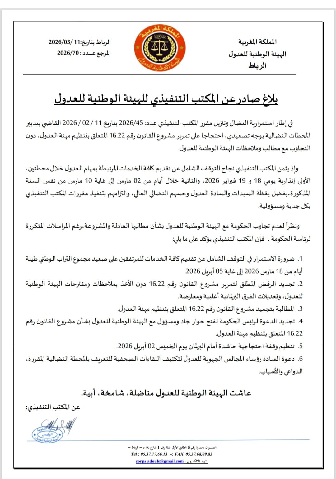 وفي ظل استمرار ما اعتبرته الهيئة تجاهلاً لمطالبها، أعلن المكتب التنفيذي عن تمديد التوقف الشامل عن تقديم الخدمات العدلية على مستوى مجموع التراب الوطني لمدة أيام إضافية تمتد من 18 مارس إلى غاية 5 أبريل 2026.