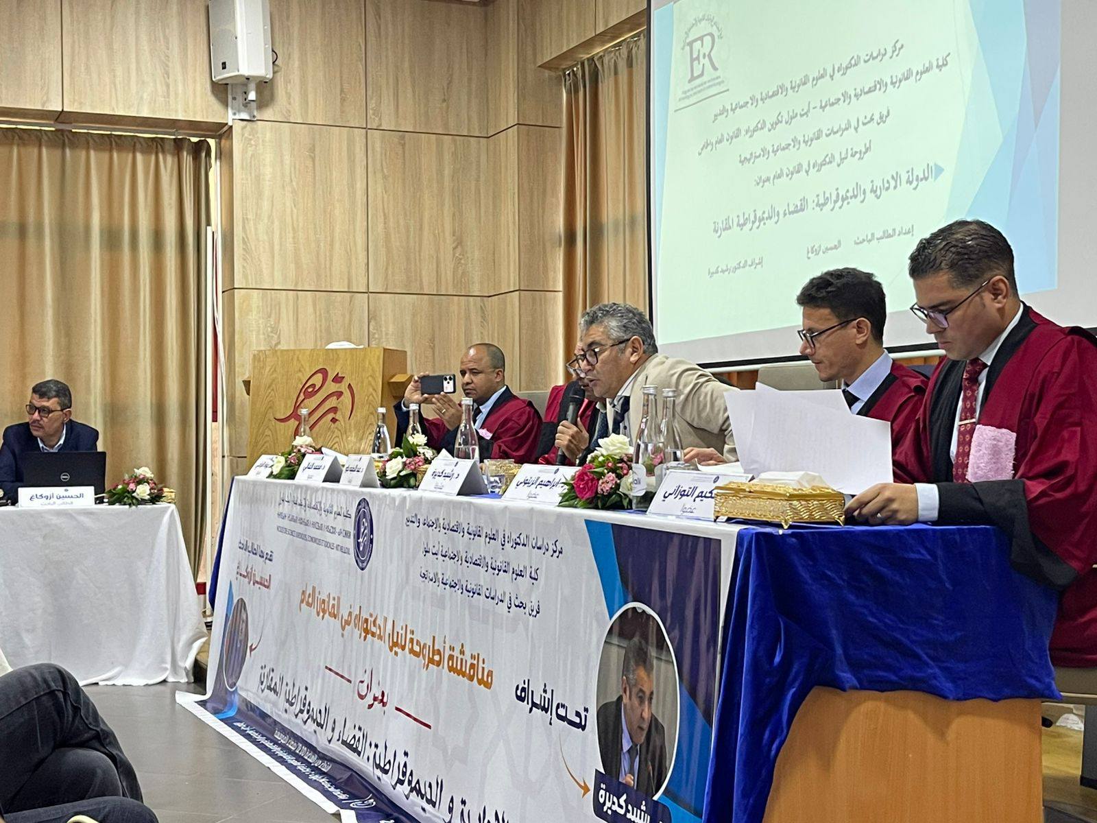 وعلى مدار ساعات من النقاش العلمي الرصين، استعرض الباحث الحسين أزوكاغ ببراعة منهجية الإشكالات الجوهرية التي عالجها في أطروحته، مسلطاً الضوء على العلاقة الجدلية والمعقدة بين الإدارة والممارسة الديمقراطية من منظور قضائي مقارن. وقد أشادت اللجنة العلمية في تقاريرها ومداخلاتها بجودة البحث وعمق التحليل، وكذا قدرة الباحث على المزاوجة بين نظريات القانون العام والواقع الميداني للممارسة السياسية والإدارية.