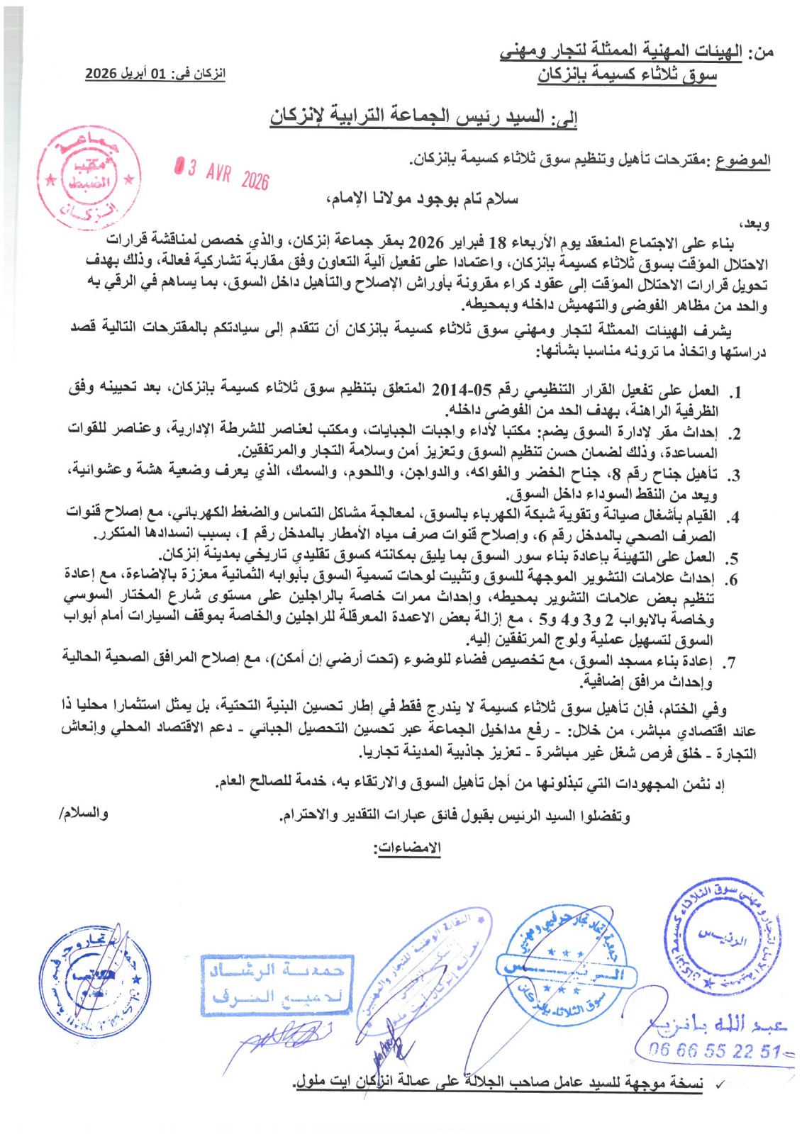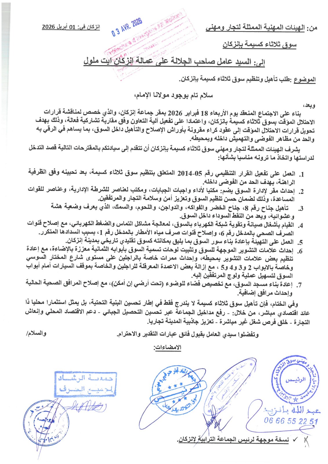 وجّهت الهيئات المهنية الممثلة لتجار ومهنيي سوق ثلاثاء كسيمة بمدينة إنزكان مراسلة رسمية إلى رئيس جماعة انزكان والى عامل الإقليم تطالب من خلالها بالتدخل العاجل من أجل تأهيل وتنظيم هذا الفضاء التجاري الحيوي، بما يستجيب لتطلعات المهنيين ويحسن ظروف اشتغالهم.